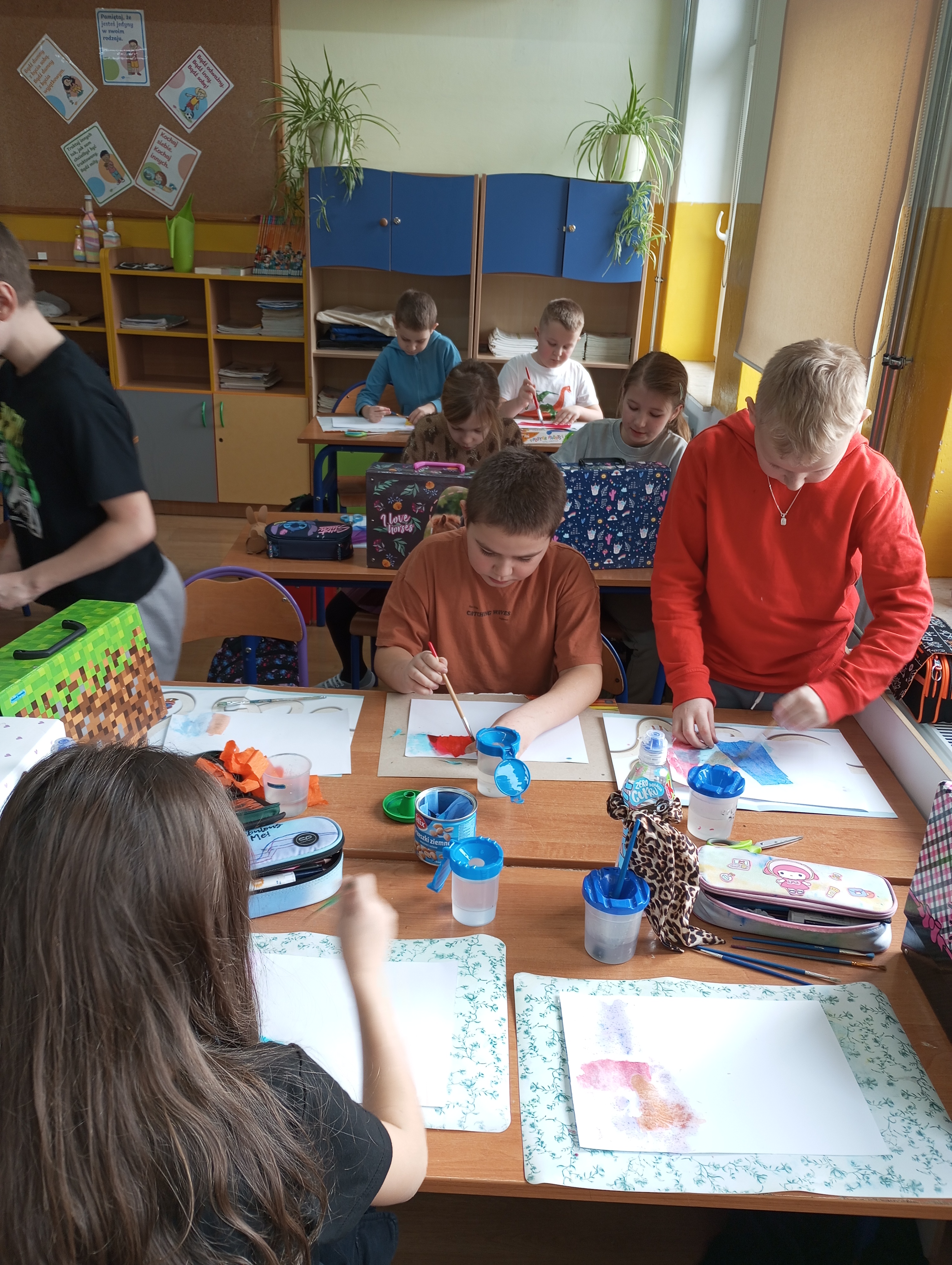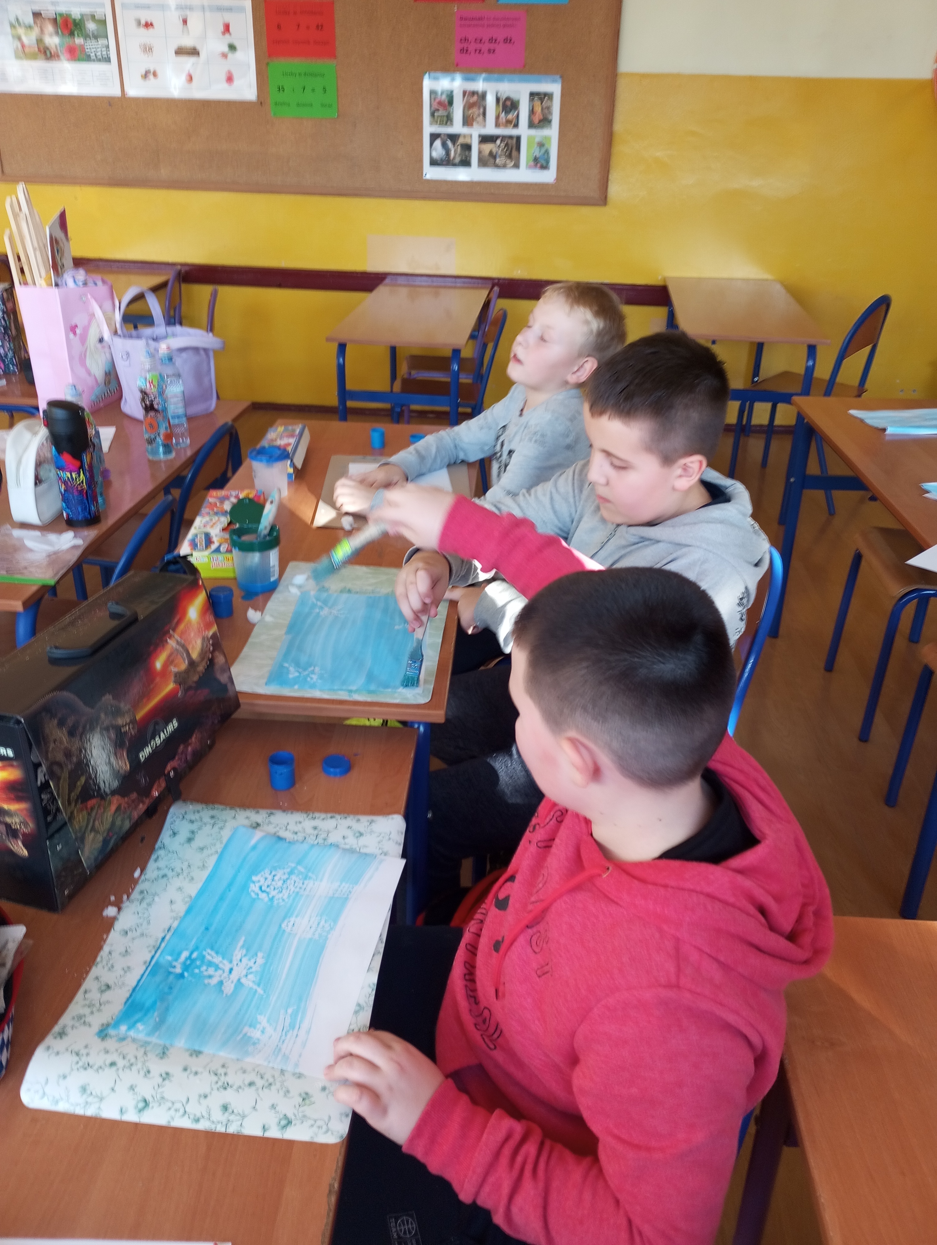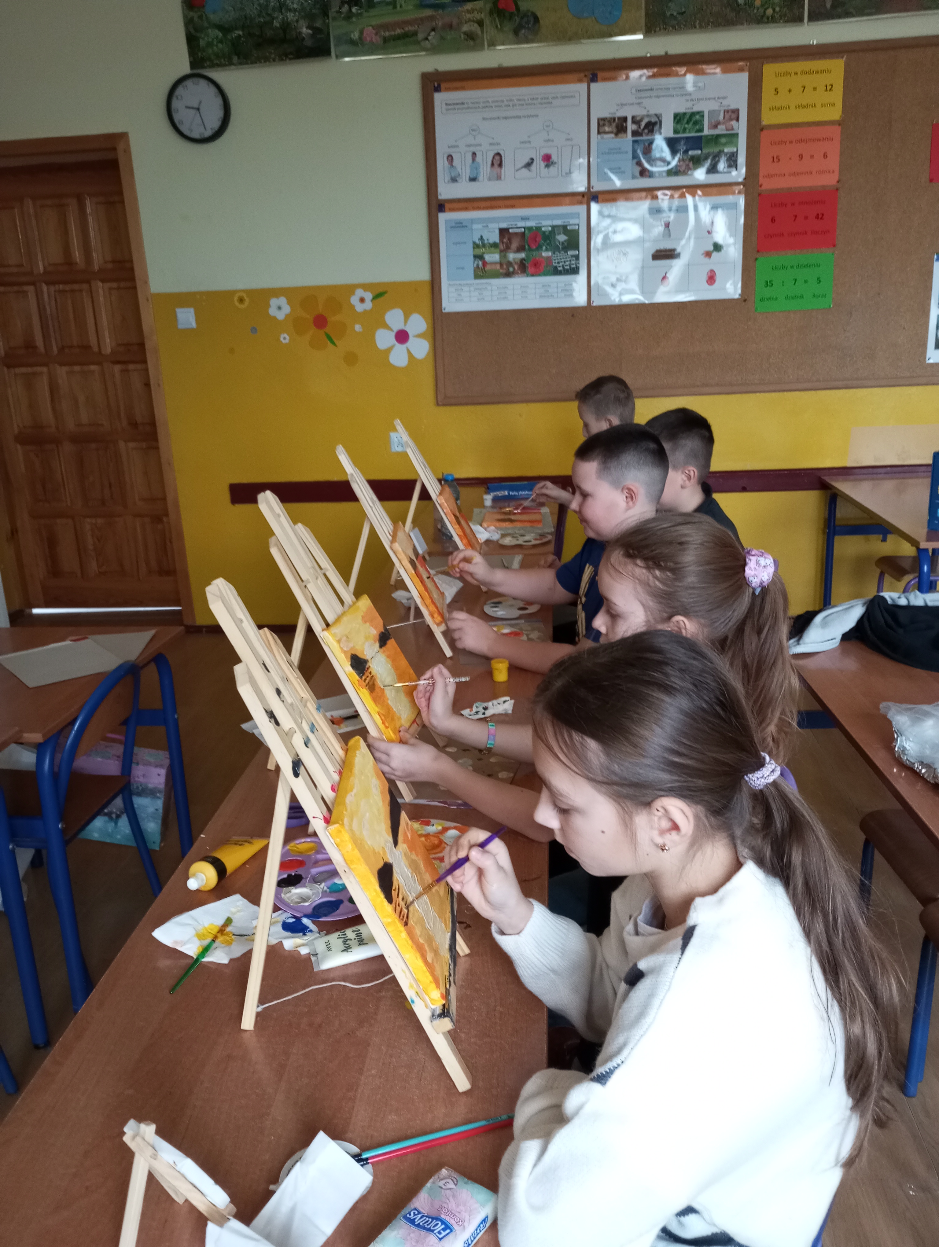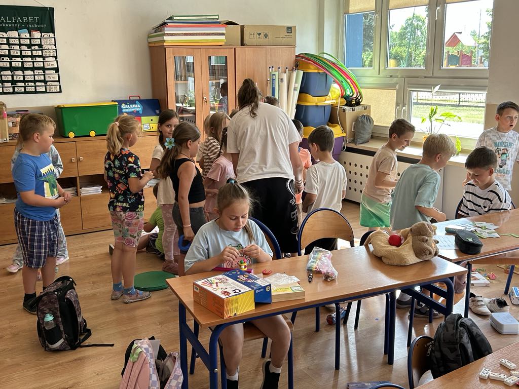 Koła plastyczno - techniczne funkcjonowało od października 2024r. do końca roku szkolnego. Uczęszczało tu 15 uczniów z klasy 3 i dwoje z klasy 1. Zajęcia odbywały się w środy. W czasie spotkań uczniowie poznawali różnorodne techniki oraz pracowali na różnych materiałach. Tematyka zajęć dotyczyła rzeczy bliskich dzieciom, a część z nich była proponowana przez samych uczęszczających. Zajęciom towarzyszyła luźna atmosfera, która wspierała indywidualną twórczość i kreatywność dzieci. Prace wykonane na kółku były prezentowane na tablicy wiszącej na korytarzu.