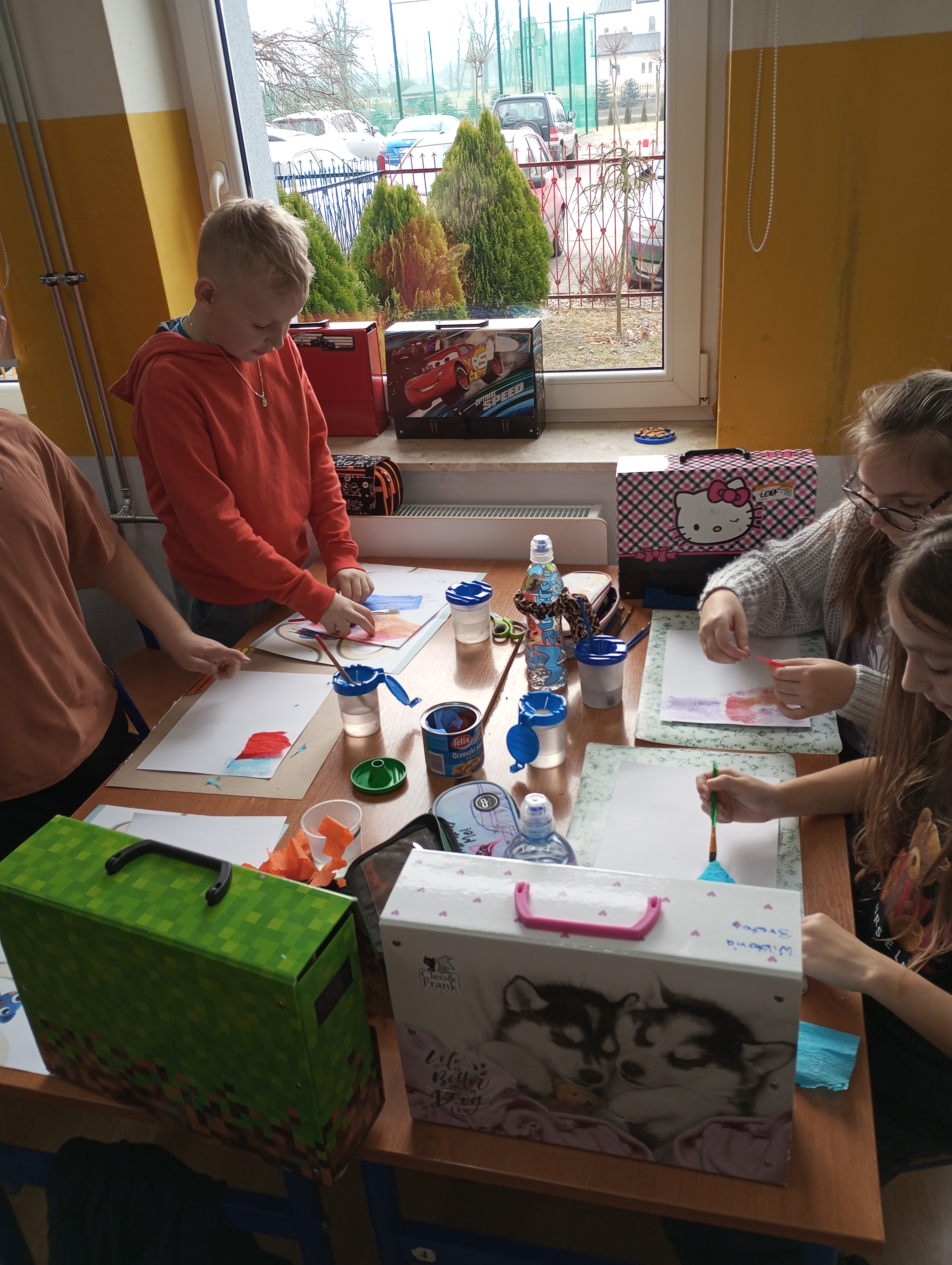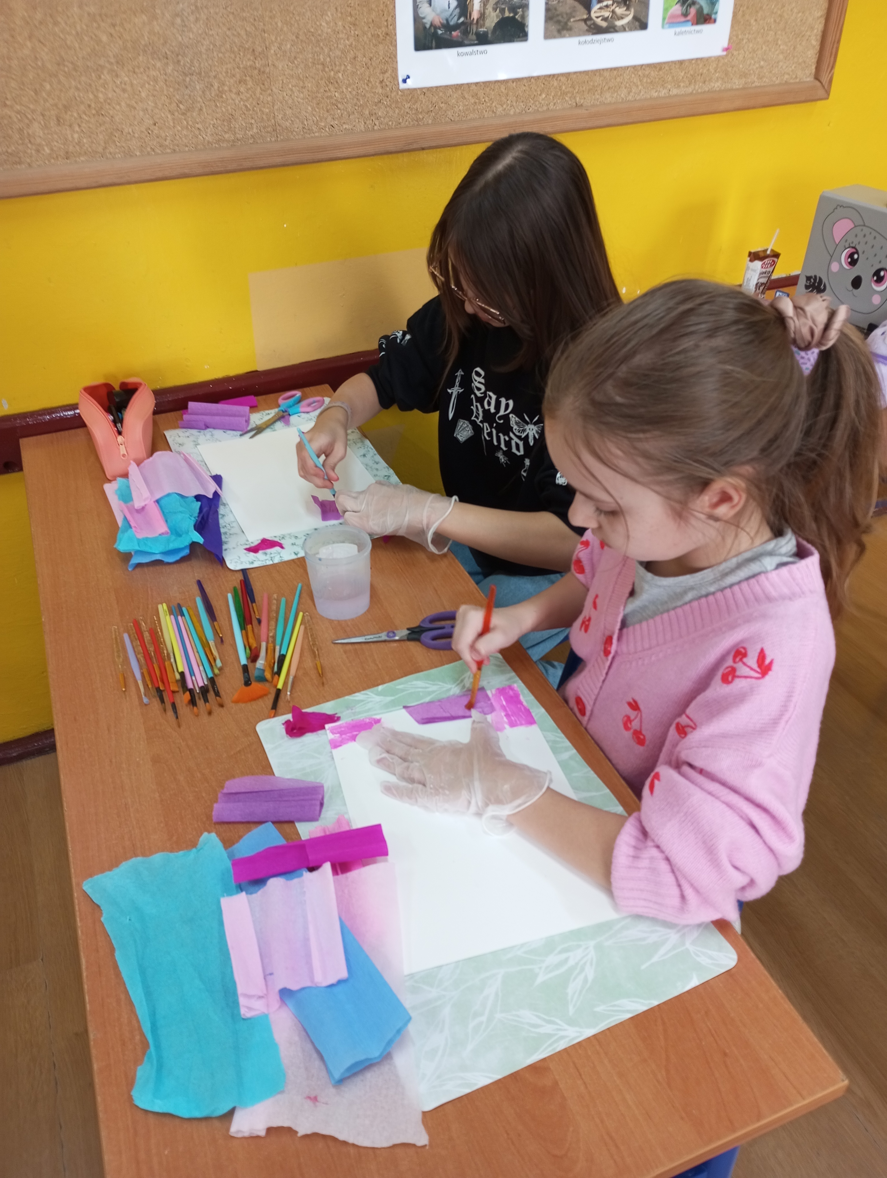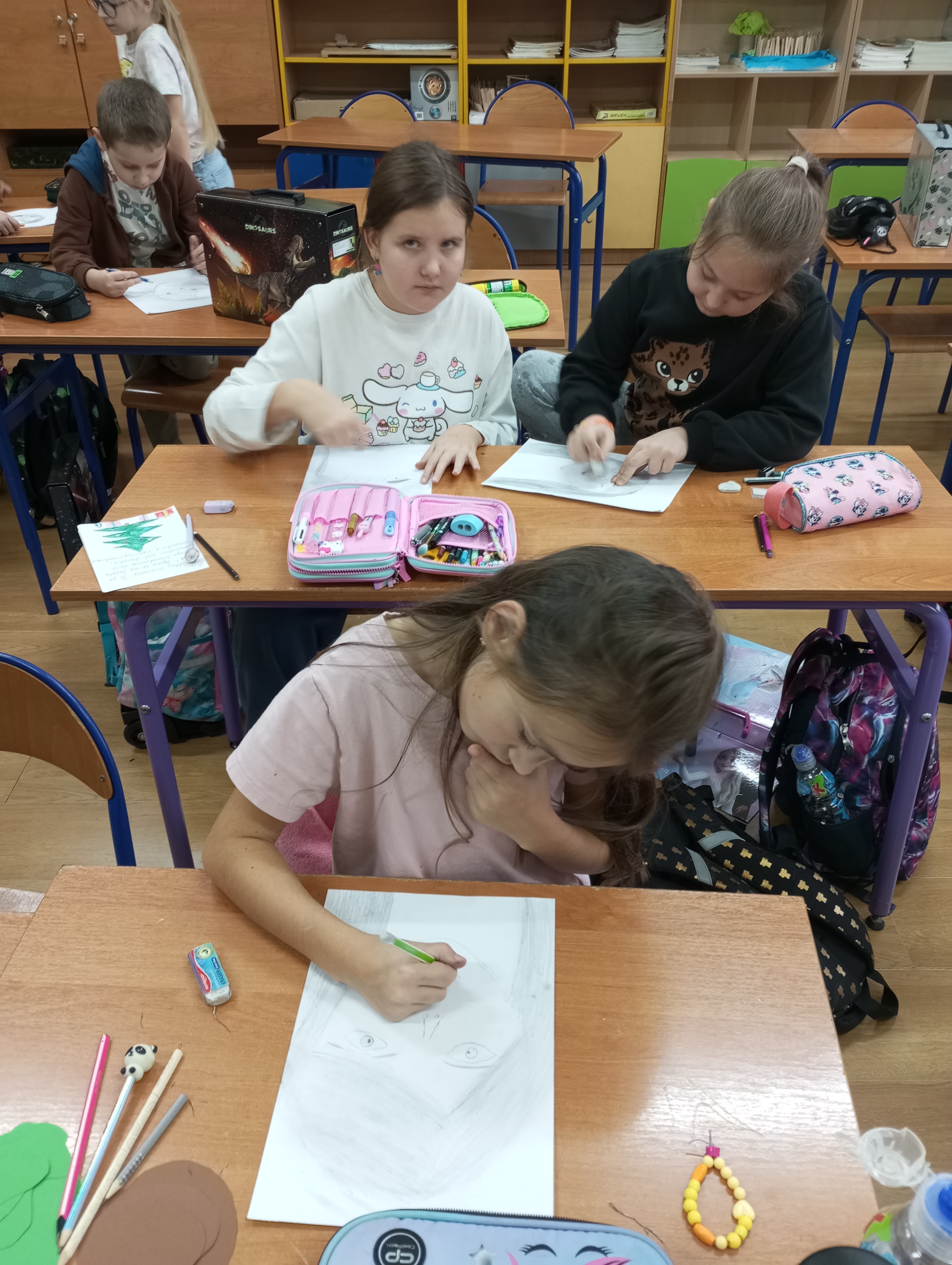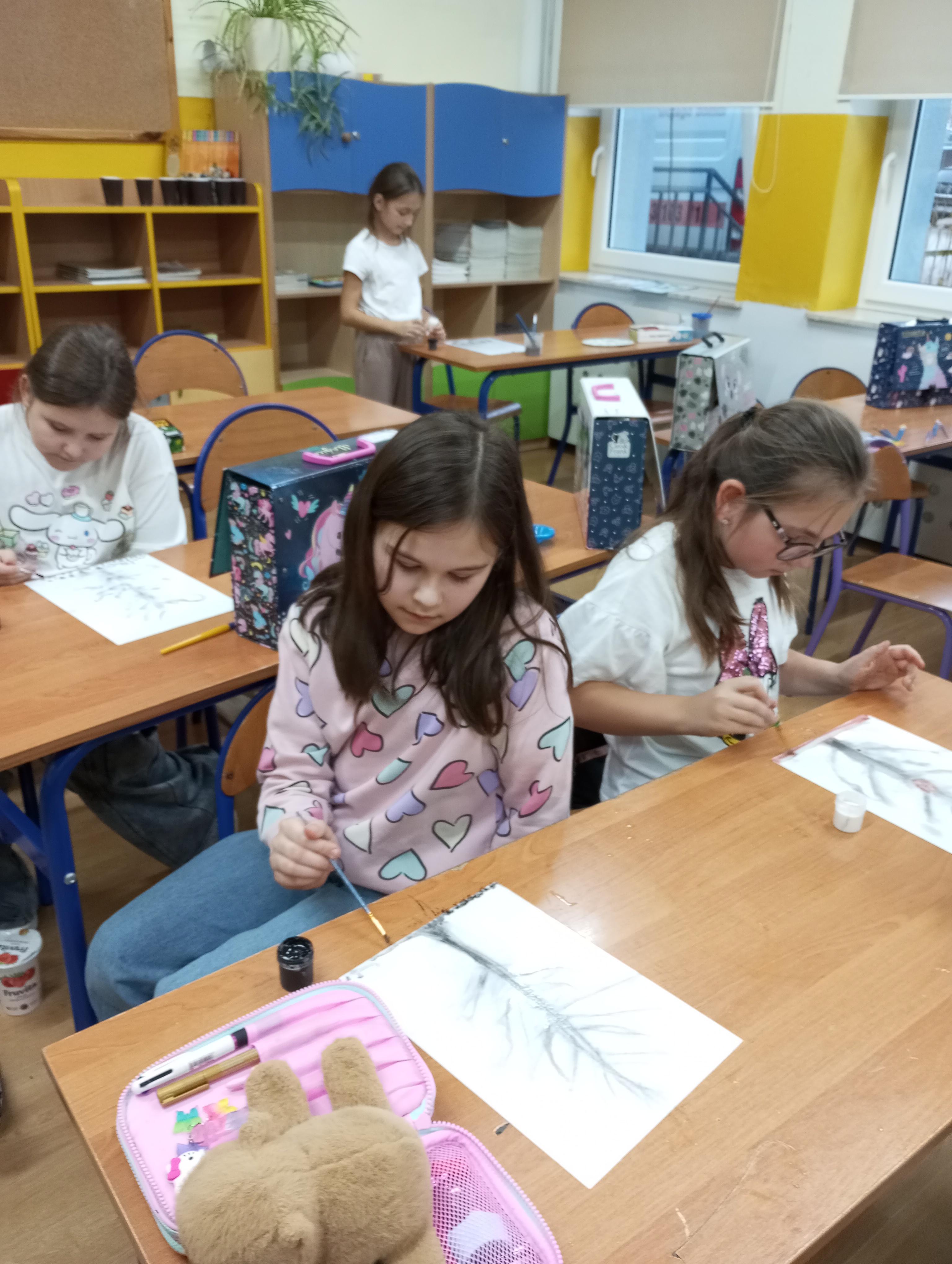 Koła plastyczno - techniczne funkcjonowało od października 2024r. do końca roku szkolnego. Uczęszczało tu 15 uczniów z klasy 3 i dwoje z klasy 1. Zajęcia odbywały się w środy. W czasie spotkań uczniowie poznawali różnorodne techniki oraz pracowali na różnych materiałach. Tematyka zajęć dotyczyła rzeczy bliskich dzieciom, a część z nich była proponowana przez samych uczęszczających. Zajęciom towarzyszyła luźna atmosfera, która wspierała indywidualną twórczość i kreatywność dzieci. Prace wykonane na kółku były prezentowane na tablicy wiszącej na korytarzu.
