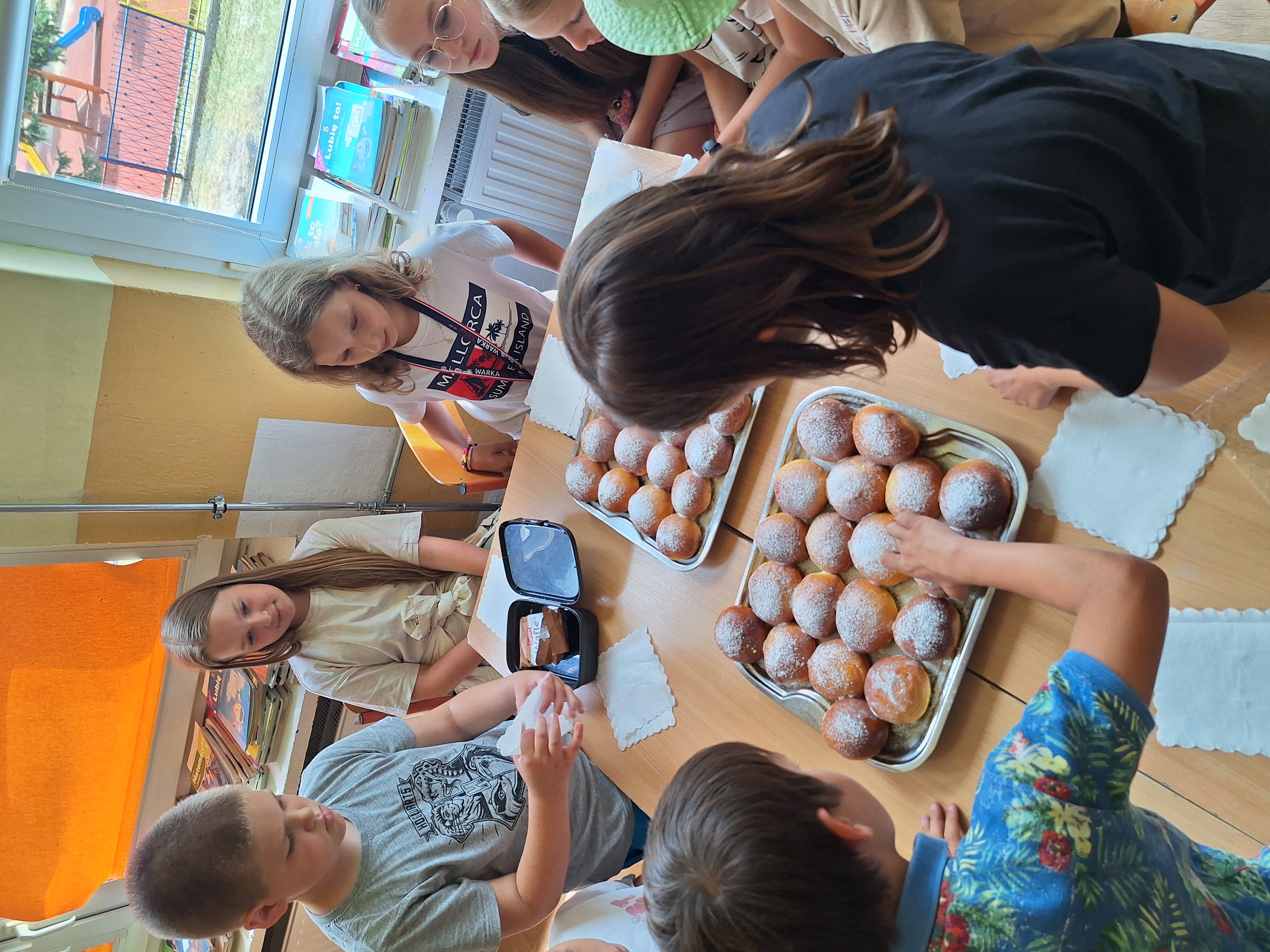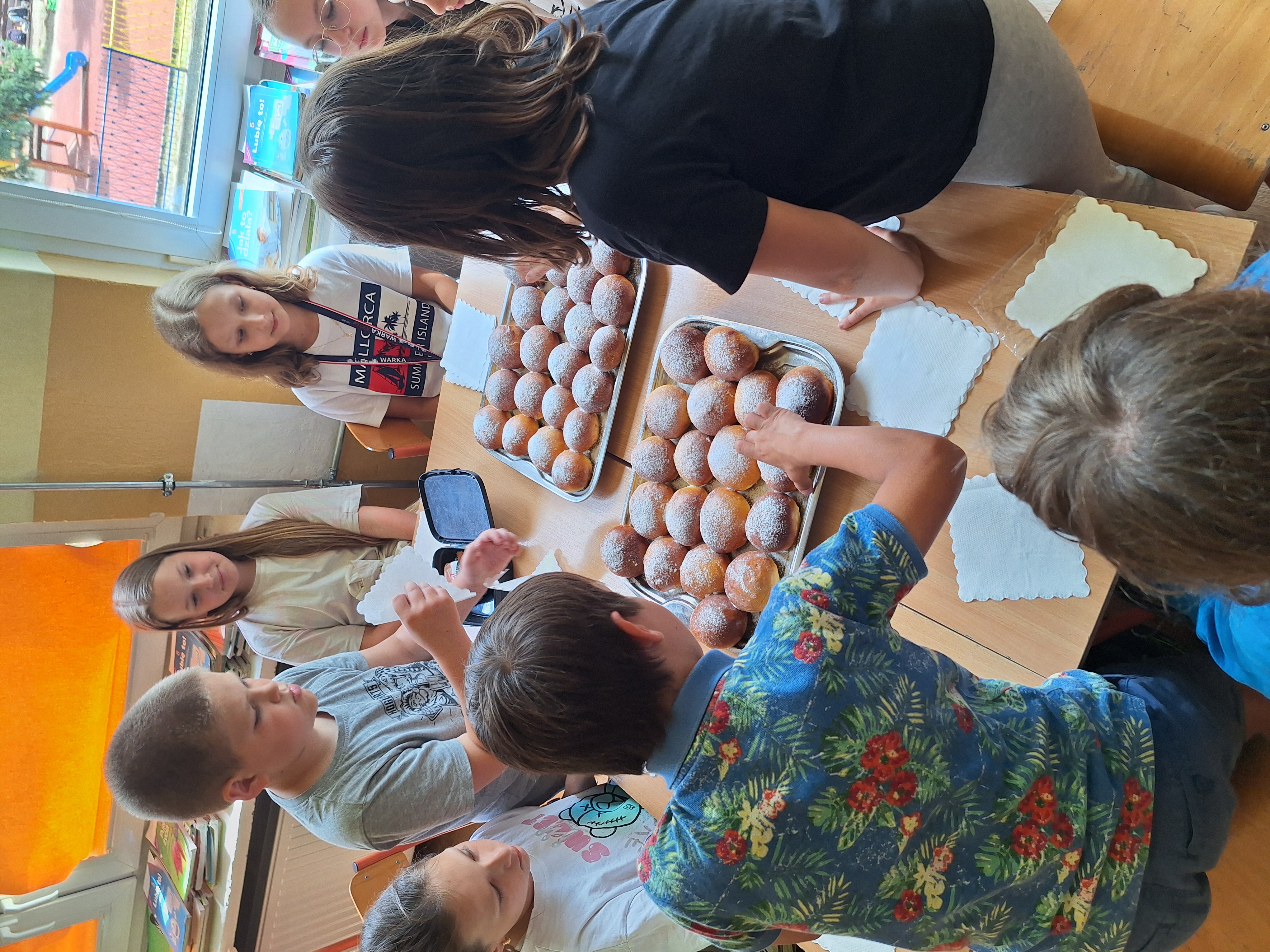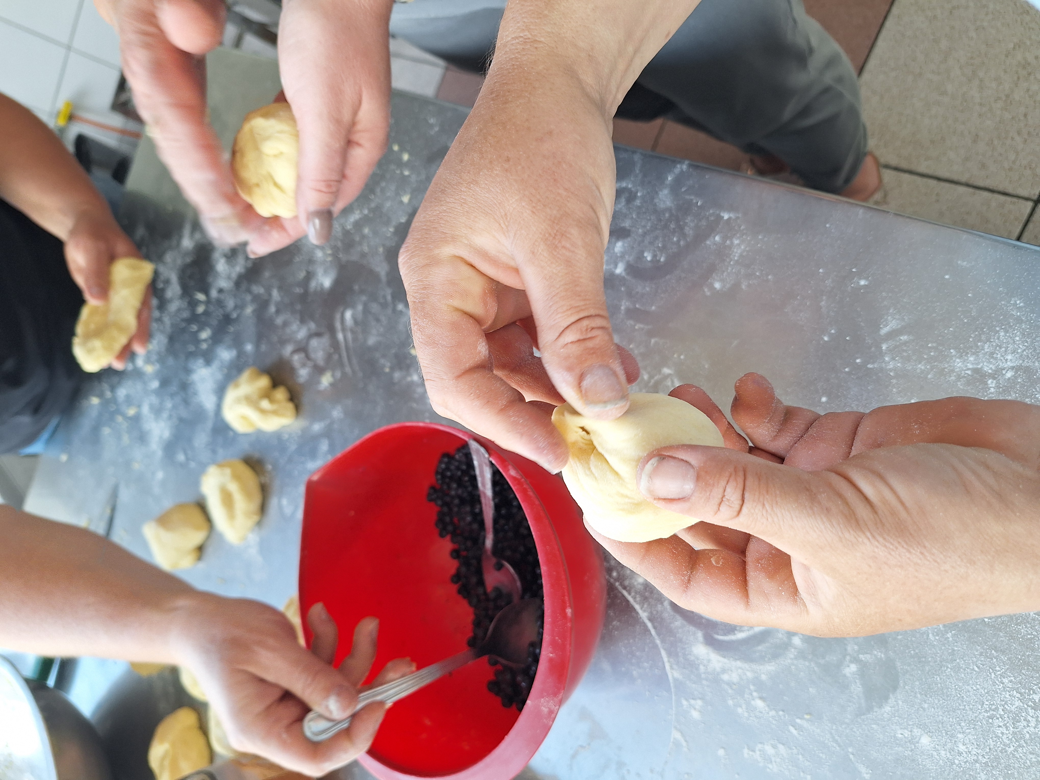 Podczas wycieczki do Królewskich Źródeł zebraliśmy świeże jagody rosnące w lesie. Po powrocie do szkoły wykorzystaliśmy je do upieczenia domowych bułek drożdżowych (jagodzianek). Ciasto przygotowaliśmy z mąki, drożdży, jajka i masła. Po wyrośnięciu nadziewaliśmy bułki jagodami wymieszanymi z cukrem i budyniem, a następnie piekliśmy je na zloty kolor. Bułki wyszły puszyste i aromatyczne.