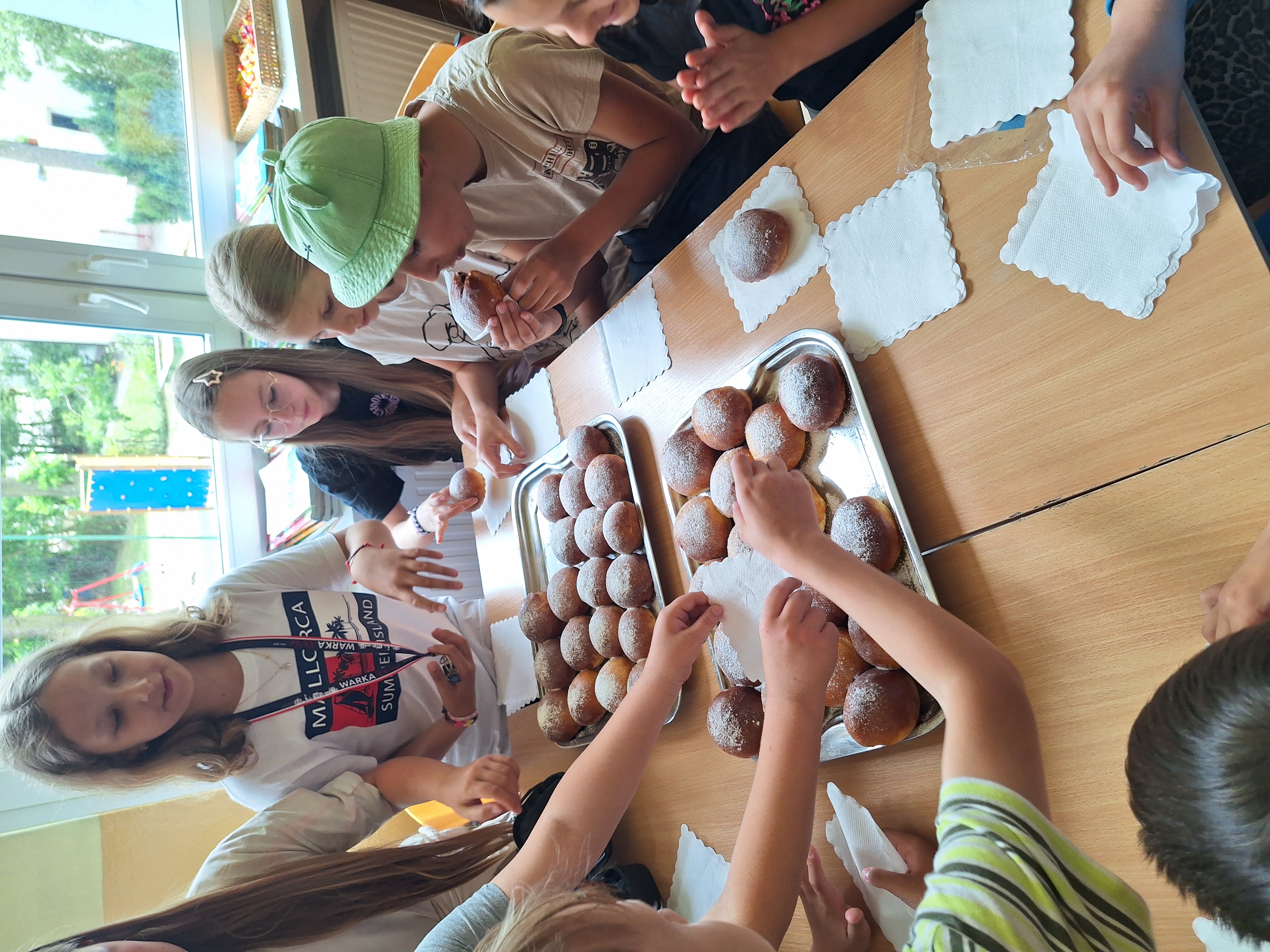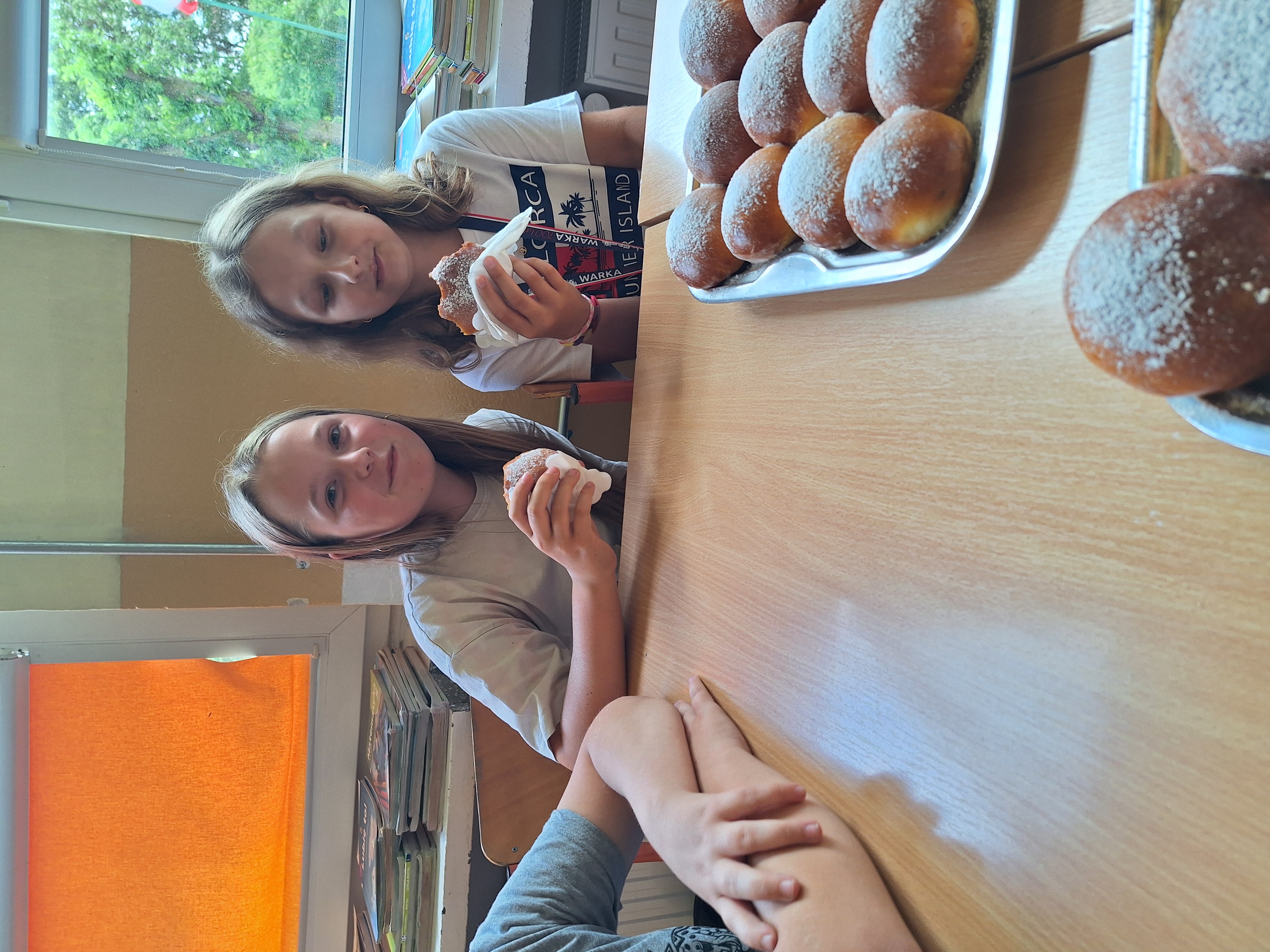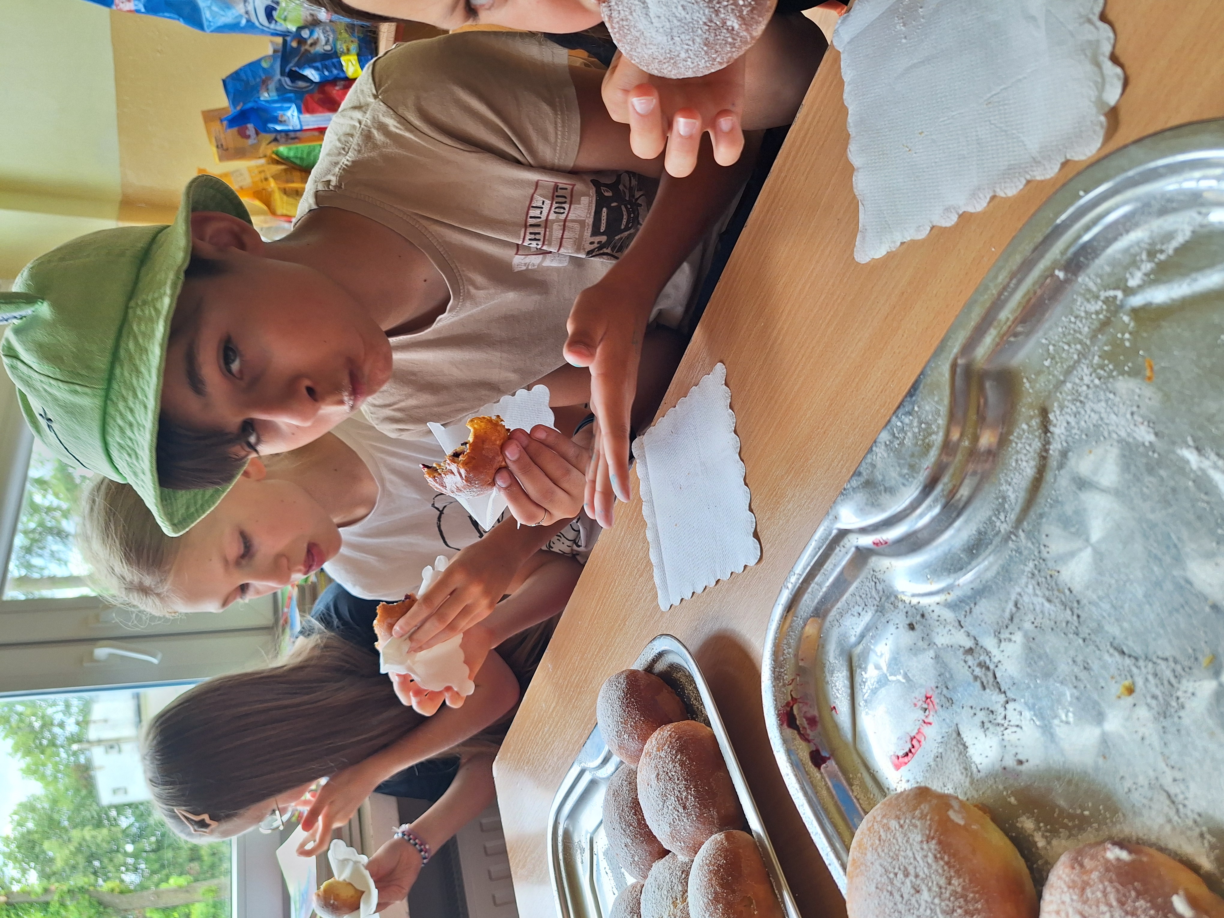 Podczas wycieczki do Królewskich Źródeł zebraliśmy świeże jagody rosnące w lesie. Po powrocie do szkoły wykorzystaliśmy je do upieczenia domowych bułek drożdżowych (jagodzianek). Ciasto przygotowaliśmy z mąki, drożdży, jajka i masła. Po wyrośnięciu nadziewaliśmy bułki jagodami wymieszanymi z cukrem i budyniem, a następnie piekliśmy je na zloty kolor. Bułki wyszły puszyste i aromatyczne.